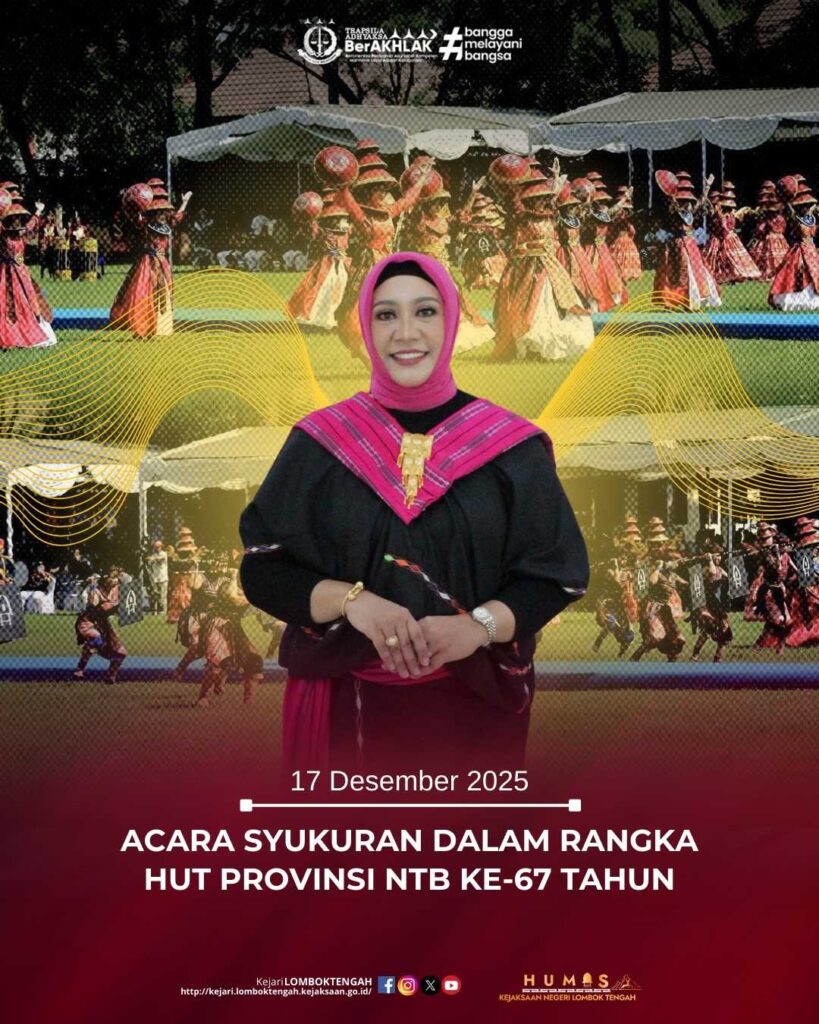 Pada hari Rabu tanggal 17 Desember 2025, bertempat di Lapangan Parade Kampus IPDN Nusa Tenggara Barat, Kepala Kejaksaan Negeri Lombok Tengah, Dr. Putri Ayu Wulandari, S.H., M.H., didampingi oleh Kepala Seksi Intelijen Kejaksaan Negeri Lombok Tengah, I Made Juri Imanu, S.H., M.H., telah mengikuti kegiatan syukuran dalam rangka HUT Provinsi NTB ke-67 Tahun dengan tema “Gerak Cepat NTB Hebat”.