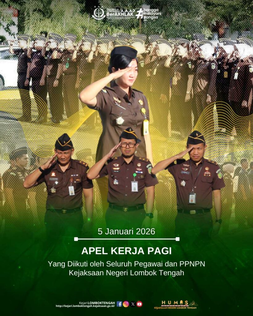 Pada Hari Senin tanggal 5 Januari 2026, bertempat di halaman Kantor Kejaksaan Negeri Lombok Tengah, dilaksanakan Apel Kerja Pagi yang diikuti oleh para Kasi, Kasubbag, serta seluruh pegawai dan PPNPN Kejaksaan Negeri Lombok Tengah, bertindak sebagai penerima apel, Kepala Seksi Perdata dan TUN Kejaksaan Negeri Lombok Tengah, Rika Ekayanti, S.H., M.H.