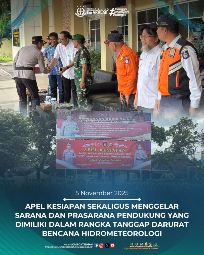 Pada hari Rabu tanggal 05 November 2025, bertempat di Lapangan Polres Lombok Tengah, Kepala Kejaksaan Negeri Lombok Tengah diwakili oleh Kepala Seksi Intelijen Kejaksaan Negeri Lombok Tengah, I Made Juri Imanu, S.H., M.H., menghadiri kegiatan Apel Kesiapan Sekaligus Menggelar Sarana Dan Prasarana Pendukung Yang Dimiliki Dalam Rangka Tanggap Darurat Bencana Hidrometeorologi sebagai bentuk pengecekan personil dan materiil yang akan digunakan bila terjadi bencana.