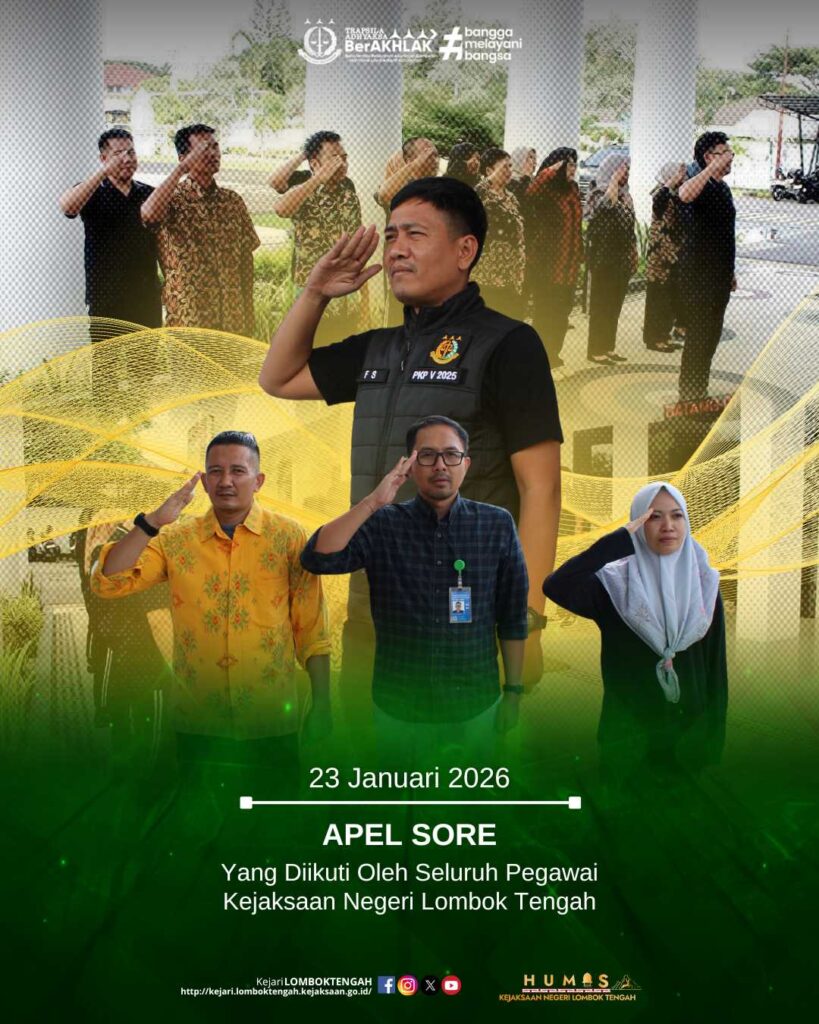 Pada Hari Jumat, tanggal 23 Januari 2026, bertempat di halaman kantor Kejaksaan Negeri Lombok Tengah, telah dilaksanakan Apel Sore yang diikuti oleh seluruh pegawai Kejaksaan Negeri Lombok Tengah, bertindak sebagai penerima apel, Kepala Seksi Tindak Pidana Umum Kejaksaan Negeri Lombok Tengah, Fajar Said, S.H., LL.M.