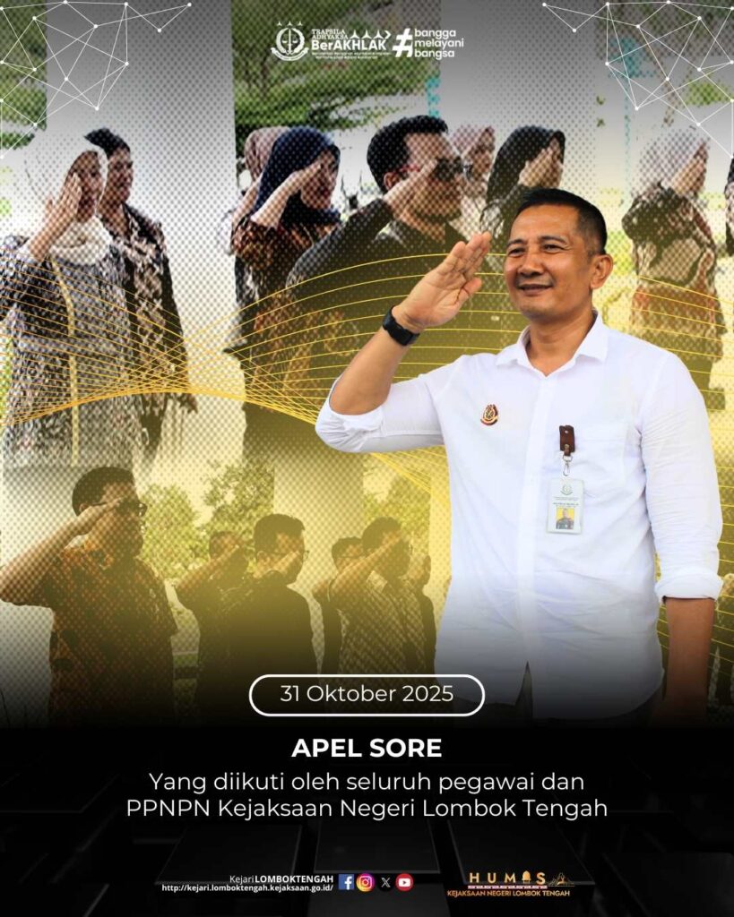 Bertempat di halaman kantor Kejaksaan Negeri Lombok Tengah, telah dilaksanakan Apel Sore yang diikuti oleh seluruh pegawai Kejaksaan Negeri Lombok Tengah, bertindak sebagai penerima apel, Kepala Sub bagian Pembinaan Kejaksaan Negeri Lombok Tengah, Lalu Ardian Amijaya, S.H., Jumat (31/10).