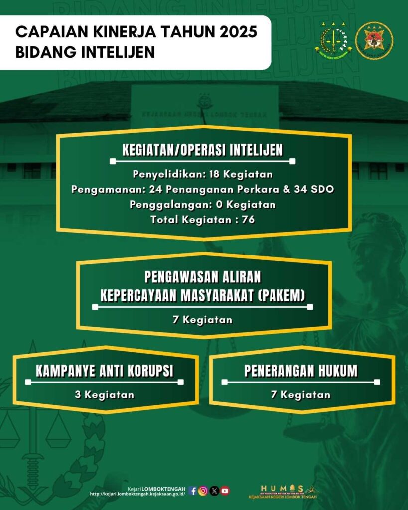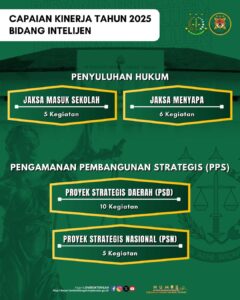 Capaian tersebut mencerminkan peran strategis Bidang Intelijen Kejaksaan sebagai garda terdepan dalam fungsi pencegahan dan deteksi dini, sekaligus menjadi fondasi penting dalam menjaga keadilan, ketertiban, dan keamanan masyarakat.