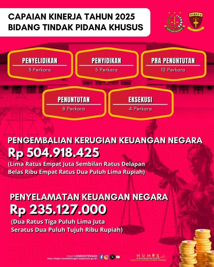 Capaian tersebut mencerminkan keteguhan Kejaksaan dalam upaya memberantas korupsi. Kejari Lombok Tengah berkomitmen untuk terus meningkatkan kualitas penanganan perkara, memperkuat sinergi, serta memperluas langkah pemulihan keuangan negara agar hasil penegakan hukum dapat dirasakan langsung oleh masyarakat.
