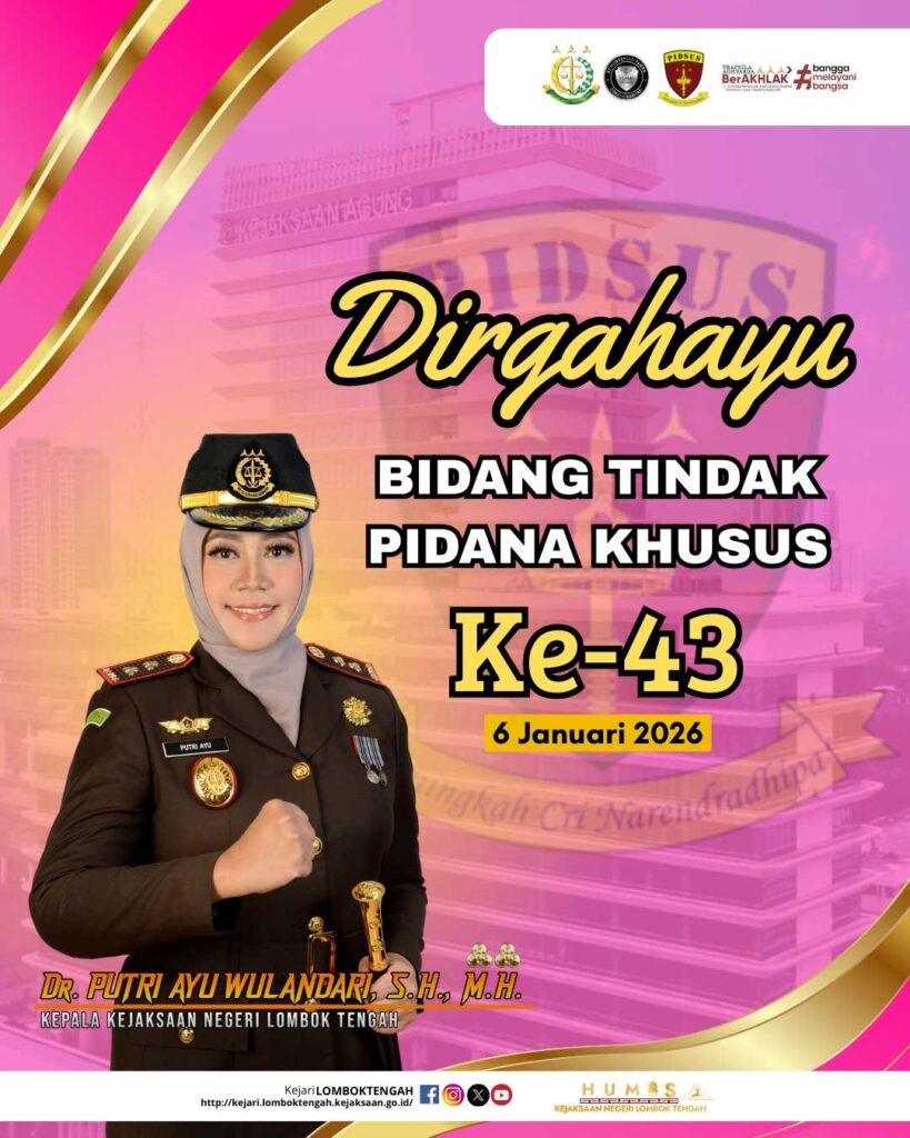 Kepala Kejaksaan Negeri Lombok Tengah, Dr. Putri Ayu Wulandari, S.H., M.H., beserta seluruh jajaran mengucapkan Dirgahayu Bidang Tindak Pidana Khusus Kejaksaan RI ke-43.