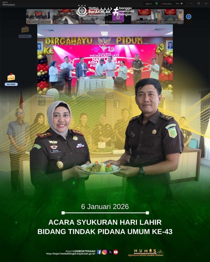 Pada hari Selasa tanggal 6 Januari 2026, bertempat di Ruang Vicon Kantor Kejaksaan Negeri Lombok Tengah, Kepala Kejaksaan Negeri Lombok Tengah, Dr. Putri Ayu Wulandari, S.H., M.H., didampingi oleh Kepala Seksi Tindak Pidana Umum Kejaksaan Negeri Lombok Tengah, Fajar Said, S.H., LL.M., dan jajaran Bidang Tindak Pidana Umum telah menghadiri acara syukuran dalam rangka memperingati Hari Lahir Bidang Tindak Pidana Umum Ke-43 secara daring melalui Zoom Meeting.