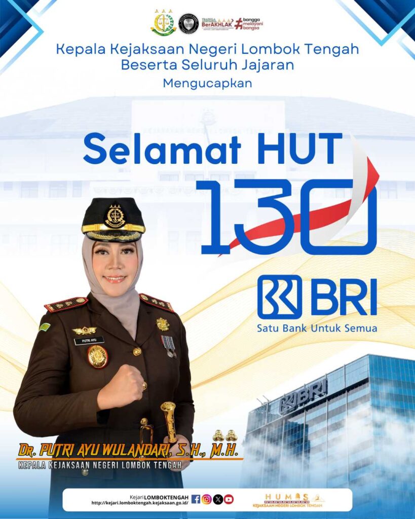 Kepala Kejaksaan Negeri Lombok Tengah, Dr. Putri Ayu Wulandari, S.H., M.H., beserta seluruh jajaran mengucapkan Selamat Memperingati HUT BRI ke-130.