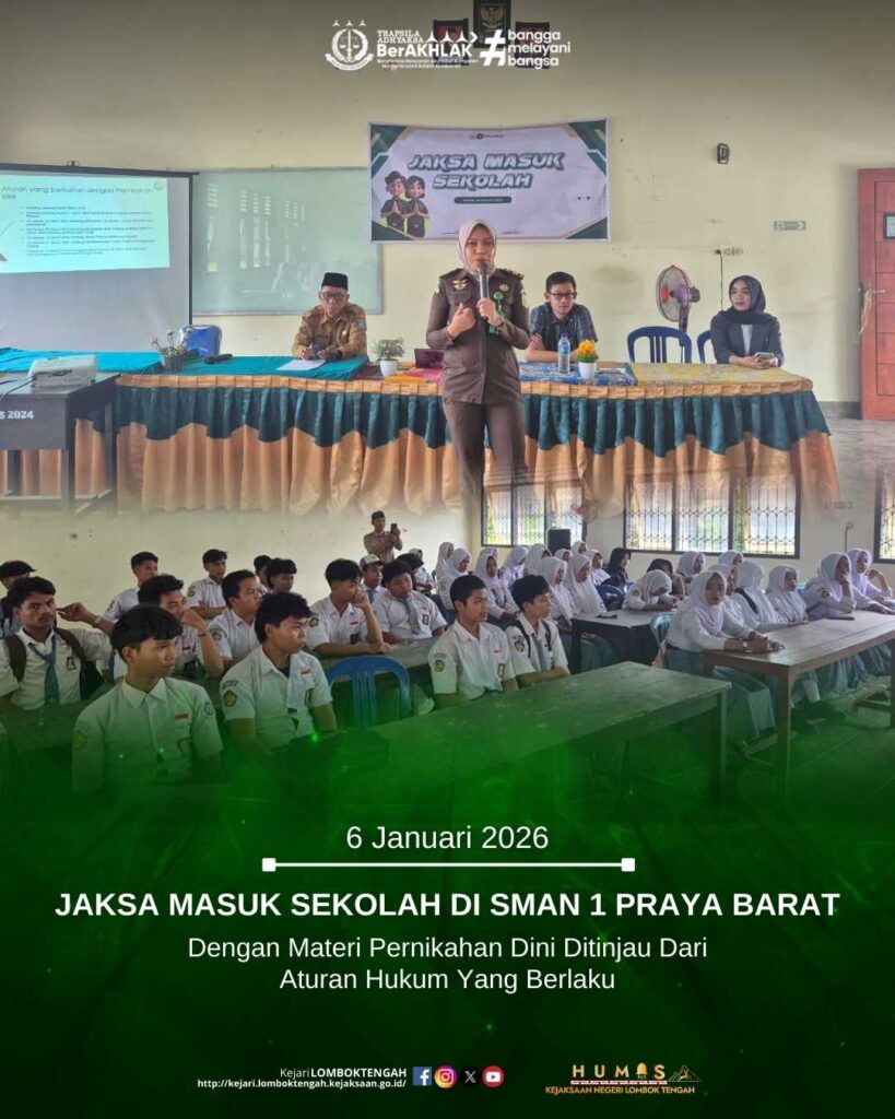 Pada hari Selasa tanggal 6 Januari 2026, bertempat di SMAN 1 Praya Barat telah dilaksanakan program Jaksa Masuk Sekolah (JMS) dengan materi Pernikahan Dini Ditinjau Dari Aturan Hukum Yang Berlaku. Kegiatan Penyuluhan Hukum (Jaksa Masuk Sekolah) merupakan kegiatan untuk memberikan pengetahuan atau mengedukasi para siswa dan siswi tentang pernikahan dini. Adapun sebagai pemateri yaitu Jaksa Fungsional pada Bidang Intelijen Kejaksaan Negeri Lombok Tengah, Nandia Amitaria, S.H.