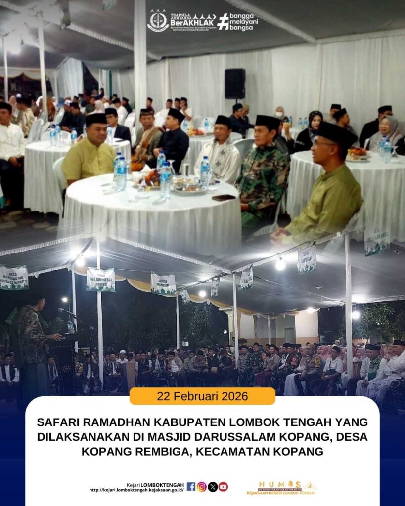 Pada hari Minggu tanggal 22 Februari 2026, bertempat di Masjid Darussalam Kopang, Jl. Raya Bung Karno Desa Kopang Rembiga Kecamatan Kopang Kabupaten Lombok Tengah, Kepala Seksi PAPBB Kejaksaan Negeri Lombok Tengah, Terry Endro Arie Wibowo, S.H., M.H. mewakili Kepala Kejaksaan Negeri Lombok Tengah, menghadiri acara Safari Ramadhan Pemerintah Kabupaten Lombok Tengah Tahun 1447H/2026M. Acara tersebut dihadiri oleh Wakil Bupati Lombok Tengah, Anggota Forkopimda Lombok Tengah, Sekretaris Daerah Lombok Tengah, Kepala OPD Lombok Tengah, Forkopimca Kopang, Kepala Desa, Tokoh Agama dan Tokoh Masyarakat se-Kecamatan Kopang.