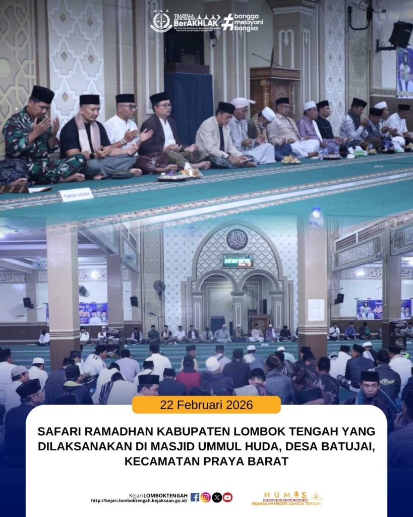 Pada hari Minggu tanggal 22 Februari 2026, bertempat di Masjid Ummul Huda Desa Batujai, Kecamatan Praya Barat, Kepala Subbagian Pembinaan Kejaksaan Negeri Lombok Tengah, Lalu Ardian Amijaya, S.H., mewakili Kepala Kejaksaan Negeri Lombok Tengah, menghadiri acara Safari Ramadhan Pemerintah Kabupaten Lombok Tengah Tahun 1447H/2026M dengan tema “Ramadhan sebagai Momentum Menuju Lombok Tengah Masmirah”. Acara tersebut dihadiri oleh Bupati Lombok Tengah, Anggota Forkopimda Lombok Tengah, Kepala OPD Lombok Tengah, Forkopimca Praya Barat, Kepala Desa, Tokoh Agama dan Tokoh Masyarakat se-Kecamatan Praya Barat.