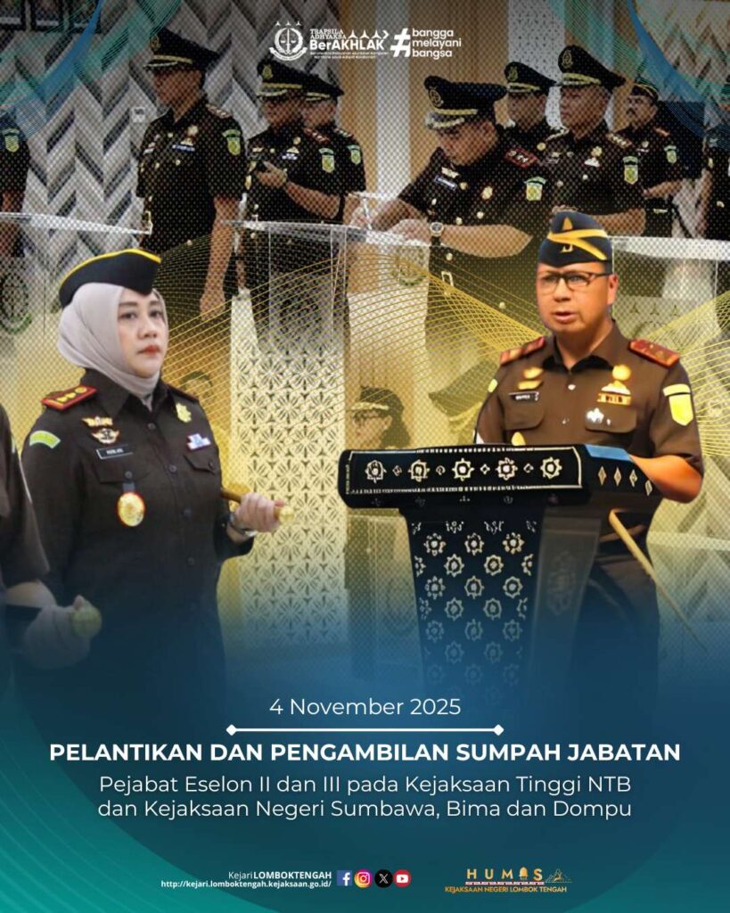 Pada hari Selasa tanggal 04 November 2025, bertempat di Aula Kejaksaan Tinggi NTB, Kepala Kejaksaan Negeri Lombok Tengah, Dr. Putri Ayu Wulandari, S.H., M.H., menghadiri kegiatan Pelantikan dan Pengambilan Sumpah Jabatan serta Pisah Sambut Pejabat Eselon II dan III pada Kejaksaan Tinggi NTB dan Kejaksaan Negeri Sumbawa, Bima dan Dompu. Adapun pejabat yang dilantik sebagai berikut: