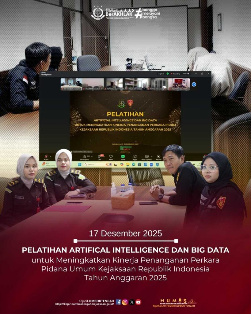 Pada hari Rabu tanggal 17 Desember 2025, bertempat di Ruang Rapat Kantor Kejaksaan Negeri Lombok Tengah, Kepala Seksi Tindak Pidana Umum, Fajar Said, S.H., LL.M., dan Kasubsi Pra Penuntutan Bidang Tindak Pidana Umum Kejaksaan Negeri Lombok Tengah, Wennys Kartika Putri, S.H., serta Operator CMS dan Staf pada Bidang Tindak Pidana Umum telah mengikuti Pelatihan Artifical Intelligence dan Big Data untuk Meningkatkan Kinerja Penanganan Perkara Pidana Umum Kejaksaan Republik Indonesia Tahun Anggaran 2025 yang dihadiri secara daring melalui Zoom Meeting.