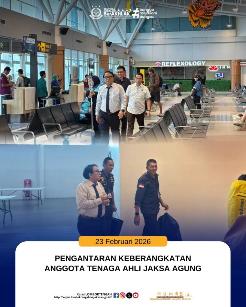 Pada hari Senin tanggal 23 Februari 2026, bertempat di Bandara Internasional Zainuddin Abdul Madjid Lombok Tengah, Kepala Seksi Intelijen Kejaksaan Negeri Lombok Tengah, Bayu Fermady, S.H., M.H., didampingi oleh Kasubsi I Bidang Intelijen Kejaksaan Negeri Lombok Tengah, Sainrama Pikasani Archimada, S.H., M.H., dan Staf telah mengikuti pengantaran keberangkatan Anggota Tenaga Ahli Jaksa Agung, Dr. Iing R. Sodikin Arifin, S.H., CN., M.H., M.Kn.