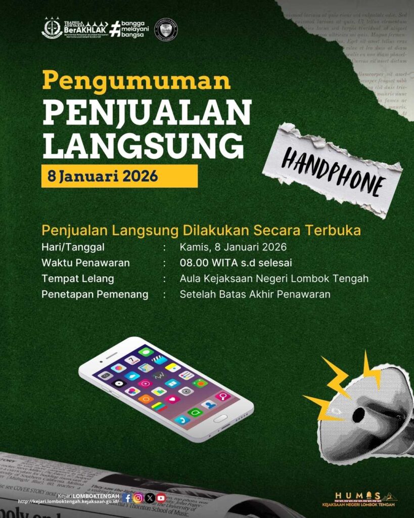 Kejaksaan Negeri Lombok Tengah melalui Bidang Pemulihan Aset dan Pengelolaan Barang Bukti akan melaksanakan penjualan langsung barang rampasan perkara Tindak Pidana Umum berupa 17 unit HP berbagai macam tipe dari 7 (tujuh) terpidana yang akan dilaksanakan pada hari Kamis, 08 Januari 2026.