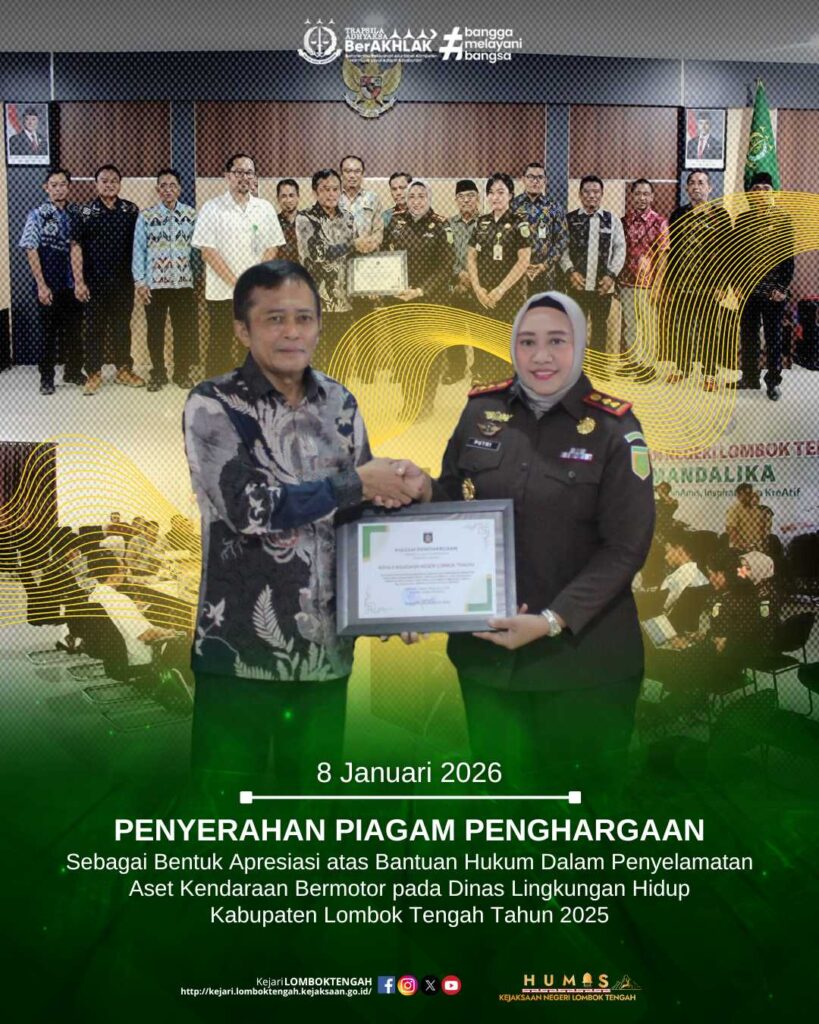 Pada hari Kamis tanggal 8 Januari 2026, bertempat di Aula Kantor Kejaksaan Negeri Lombok Tengah, telah dilaksanakan kegiatan Penyerahan Piagam Penghargaan oleh Bupati Lombok Tengah, H. Lalu Pathul Bahri, S.I.P., M.A.P., kepada Kepala Kejaksaan Negeri Lombok Tengah, Dr. Putri Ayu Wulandari, S.H., M.H., sebagai bentuk apresiasi atas dedikasi, kinerja, dan kontribusi luar biasa Seksi Perdata dan Tata Usaha Negara Kejaksaan Negeri Lombok Tengah atas bantuan hukum dalam penyelamatan aset kendaraan bermotor pada Dinas Lingkungan Hidup Kabupaten Lombok Tengah Tahun 2025, berupa 1 (satu) unit kendaraan Daihatsu Pick Up dan 1 (satu) unit Truck Attachment (Arm Roll) dengan nilai total sebesar Rp120.000.000,00 (seratus dua puluh juta rupiah).