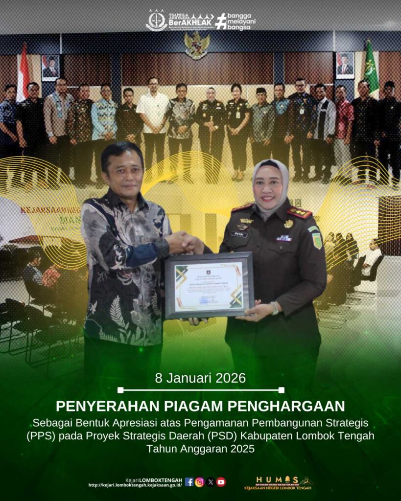 Pada hari Kamis tanggal 8 Januari 2026, bertempat di Aula Kantor Kejaksaan Negeri Lombok Tengah, telah dilaksanakan kegiatan Penyerahan Piagam Penghargaan oleh Bupati Lombok Tengah, H. Lalu Pathul Bahri, S.I.P., M.A.P., kepada Kepala Kejaksaan Negeri Lombok Tengah, Dr. Putri Ayu Wulandari, S.H., M.H., sebagai bentuk apresiasi atas dedikasi, kinerja, dan kontribusi luar biasa Seksi Intelijen Kejaksaan Negeri Lombok Tengah dalam Pengamanan Pembangunan Strategis (PPS) pada Proyek Strategis Daerah (PSD) Kabupaten Lombok Tengah Tahun Anggaran 2025.