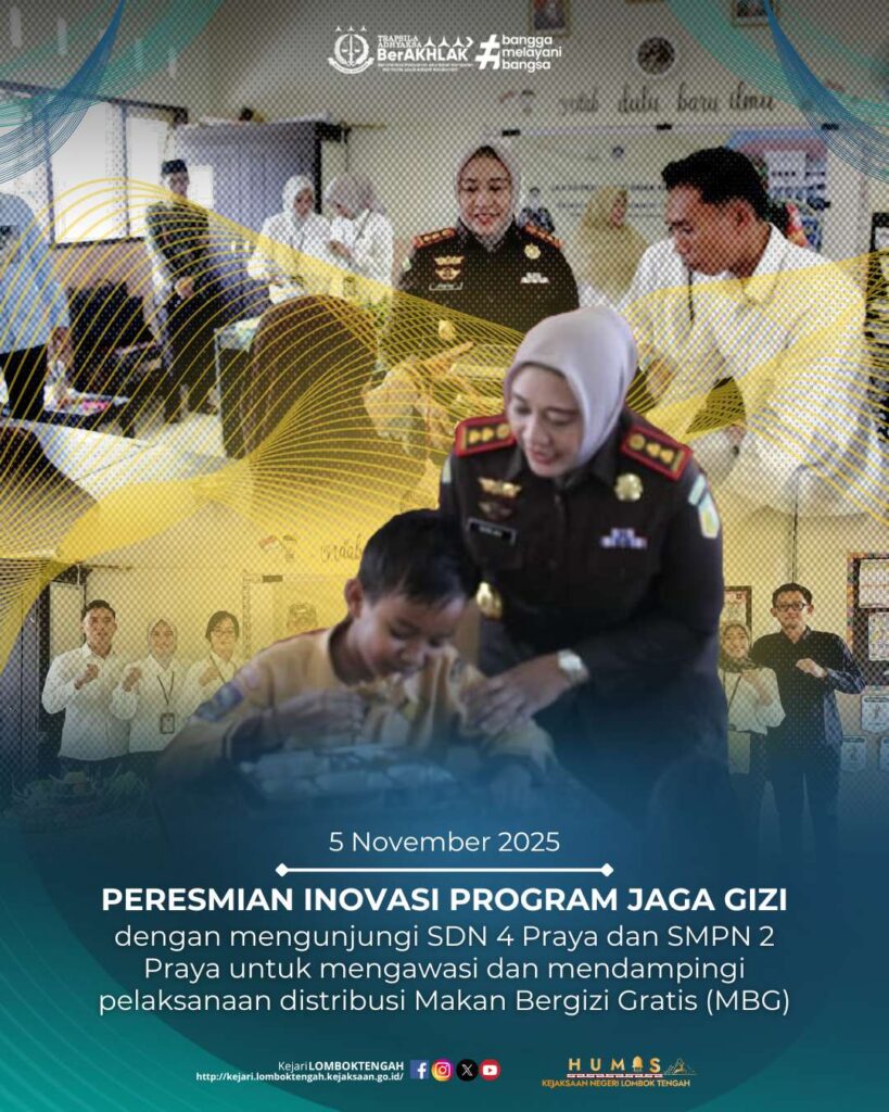 Pada hari Rabu, 5 November 2025 Kepala Kejaksaan Negeri Lombok Tengah, Dr. Putri Ayu Wulandari, S.H., M.H., meresmikan Inovasi Program JAGA GIZI (Jaksa Peduli Gizi Anak Nasional) dengan mengunjungi SDN 4 Praya dan SMPN 2 Praya untuk mengawasi dan mendampingi pelaksanaan distribusi Makan Bergizi Gratis (MBG) ke sekolah-sekolah di Kabupaten Lombok Tengah dalam program JAGA GIZI ”JAKSA PEDULI GIZI ANAK NASIONAL”. Kegiatan ini merupakan bagian dari Program Prioritas Nasional sesuai dengan amanat yang tertuang dalam Astacita Presiden dan Wakil Presiden Republik Indonesia, demi mendukung terpenuhinya kebutuhan gizi anak sebagai investasi sumber daya manusia unggul di masa depan sebagai suatu program unggulan Bidang Perdata dan Tata Usaha Negara dalam rangka Rencana Aksi Nasional (RAN).