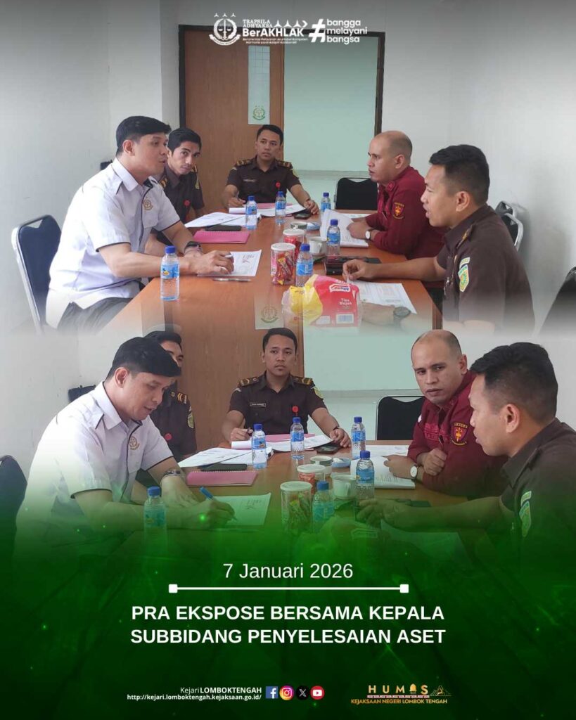 Pada hari Rabu tanggal 7 Januari 2026 bertempat di Kejaksaan Tinggi Nusa Tenggara Barat, Kepala Seksi Pemulihan Aset dan Pengelolaan Barang Bukti beserta jajaran dengan Kepala Seksi Tindak Pidana Khusus beserta jajaran telah melaksanakan Pra Ekspose bersama Kepala Subbidang Penyelesaian Aset mengenai Progres Penanganan Barang Sita Eksekusi dalam perkara Tindak Pidana Korupsi An. Terpidana INS. Pelaksanaan Pra Ekspose bertujuan untuk menyamakan persepsi dalam hal percepatan penyelesaian Barang Sita Eksekusi guna menutupi Uang Pengganti atas Kerugian Negara dari perkara dimaksud.
