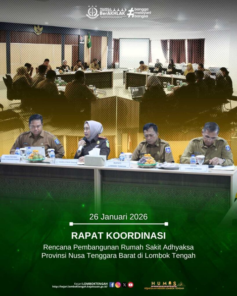 Pada Hari Senin tanggal 26 Januari 2026, telah dilaksanakan Rapat Koordinasi Rencana Pembangunan Rumah Sakit Adhyaksa Provinsi NTB di Wilayah Lombok Tengah, bertempat di Aula Kejaksaan Negeri Lombok Tengah. Sebagai pemimpin rapat, Kepala Kejaksaan Negeri Lombok Tengah, Dr. Putri Ayu Wulandari, S.H., M.H., dan hadir dalam kegiatan tersebut Kepala Dinas Kesehatan Provinsi Nusa Tenggara Barat, Bupati Lombok Tengah, Kepala Bidang Pelayanan Kesehatan Dinas Kesehatan Kabupaten Lombok Tengah, Kepala Dinas Pekerjaan Umum dan Penataan Ruang Kabupaten Lombok Tengah, Direktur RSUD Praya Kabupaten Lombok Tengah, Kepala Dinas Penanaman Modal dan Pelayanan Terpadu Satu Pintu Kabupaten Lombok Tengah, Kepala Bapperida Kabupaten Lombok Tengah serta Para Kasi, Jaksa dan pegawai pada Kejaksaan Negeri Lombok Tengah.