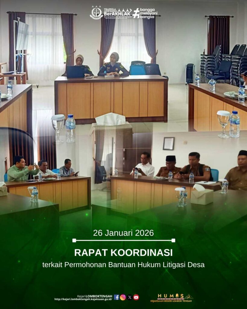 Pada Hari Senin tanggal 26 Januari 2026, bertempat di Kantor Kejaksaan Negeri Lombok Tengah telah dilaksanakan Rapat Koordinasi terkait Permohonan Bantuan Hukum Litigasi Desa. Adapun kegiatan ini dihadiri oleh Kepala Sub Seksi Perdata dan TUN, Ade Hasna Fauziah, S.H., Kepala Desa Puyung, Kepala Desa Nyerot, Kepala Desa Barejulat, Sekdes Gemel dan Kuasa Hukum dari keempat Desa tersebut.