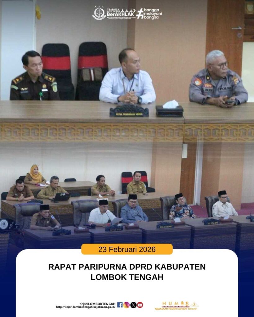 Pada hari Senin tanggal 23 Februari 2026, bertempat di Ruang Rapat Paripurna Kantor DPRD Kabupaten Lombok Tengah, Kepala Kejaksaan Negeri Lombok Tengah diwakili Kepala Seksi Intelijen Kejaksaan Negeri Lombok Tengah, Bayu Fermady, S.H., M.H., telah menghadiri Rapat Paripurna DPRD Kabupaten Lombok Tengah yang membahas tentang :