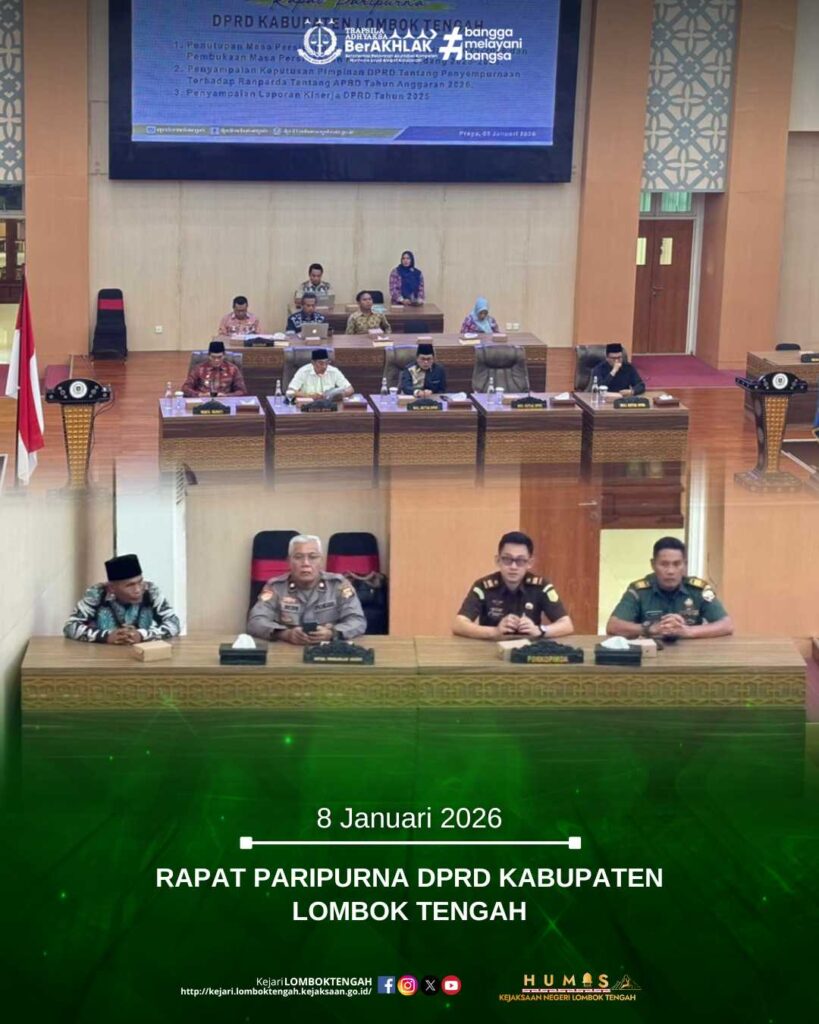 Pada hari Kamis tanggal 8 Januari 2026, bertempat di Ruang Rapat Paripurna Kantor DPRD Kabupaten Lombok Tengah, Kepala Kejaksaan Negeri Lombok Tengah diwakili Kasubsi I Bidang Intelijen Kejaksaan Negeri Lombok Tengah, Sainrama Pikasani Archimada, S.H., M.H., telah menghadiri Rapat Paripurna DPRD Kabupaten Lombok Tengah dengan pembahasan: