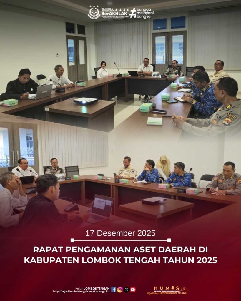 Pada hari Rabu tanggal 17 Desember 2025, bertempat di Ruang Rapat BKAD Kabupaten Lombok Tengah, Kepala Seksi Intelijen Kejaksaan Negeri Lombok Tengah, I Made Juri Imanu, S.H., M.H., dan Kepala Seksi Perdata dan TUN Kejaksaan Negeri Lombok Tengah, Rika Ekayanti, S.H., M.H., telah mengikuti Rapat Pengamanan Aset Daerah di Kabupaten Lombok Tengah tahun 2025.