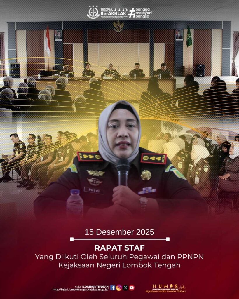 Pada Hari Senin tanggal 15 Desember 2025, bertempat di Aula Kantor Kejaksaan Negeri Lombok Tengah, telah dilaksanakan Rapat Staf yang dipimpin oleh Kepala Kejaksaan Negeri Lombok Tengah, Dr. Putri Ayu Wulandari, S.H., M.H., diikuti oleh para Kasi dan Kasubagbin serta seluruh pegawai dan PPNPN Kejaksaan Negeri Lombok Tengah.