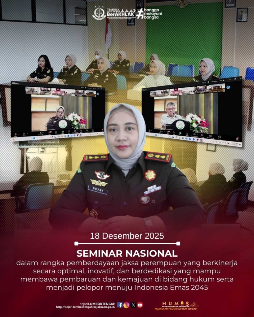 Pada hari Kamis tanggal 18 Desember 2025, bertempat di Ruang Vicon Kantor Kejaksaan Negeri Lombok Tengah, Kepala Kejaksaan Negeri Lombok Tengah, Dr. Putri Ayu Wulandari, S.H., M.H., didampingi oleh Kasubsi Pertimbangan Hukum, Indah Rizkika Budiyanti, S.H., Kasubsi Perdata dan TUN, Ade Hasna Fauziah, S.H., Kasubsi Pra Penuntutan Bidang Tindak Pidana Umum, Wennys Kartika Putri, S.H., Kasubsi Penuntutan, Eksekusi dan Eksaminasi Bidang Tindak Pidana Umum, Fitriana Maghfirah, S.H., M.Kn., dan Jaksa Fungsional Perempuan Kejaksaan Negeri Lombok Tengah telah mengikuti kegiatan dengan tema “Perempuan PERSAJA Berkarya – Inovasi Untuk Negeri” dalam rangka pemberdayaan jaksa perempuan yang berkinerja secara optimal, inovatif, dan berdedikasi yang mampu membawa pembaruan dan kemajuan di bidang hukum serta menjadi pelopor menuju Indonesia Emas 2045 yang dihadiri secara daring melalui Zoom Meeting.