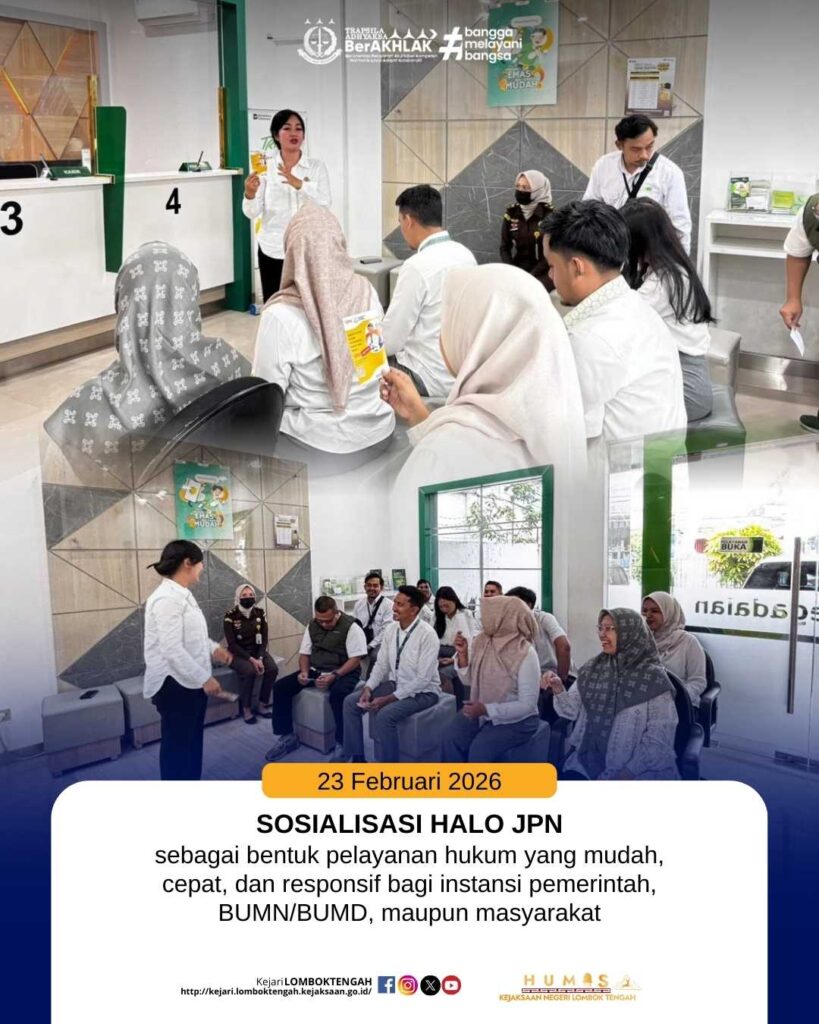 Pada hari Senin, 23 Februari 2026, bertempat di Kantor PT Pegadaian (Persero) Unit Renteng, Kecamatan Praya, Kabupaten Lombok Tengah, Kejaksaan Negeri Lombok Tengah melalui Jaksa Pengacara Negara (JPN) melaksanakan kegiatan Sosialisasi HALO JPN sebagai bentuk pelayanan hukum yang mudah, cepat, dan responsif bagi instansi pemerintah, BUMN/BUMD, maupun masyarakat.