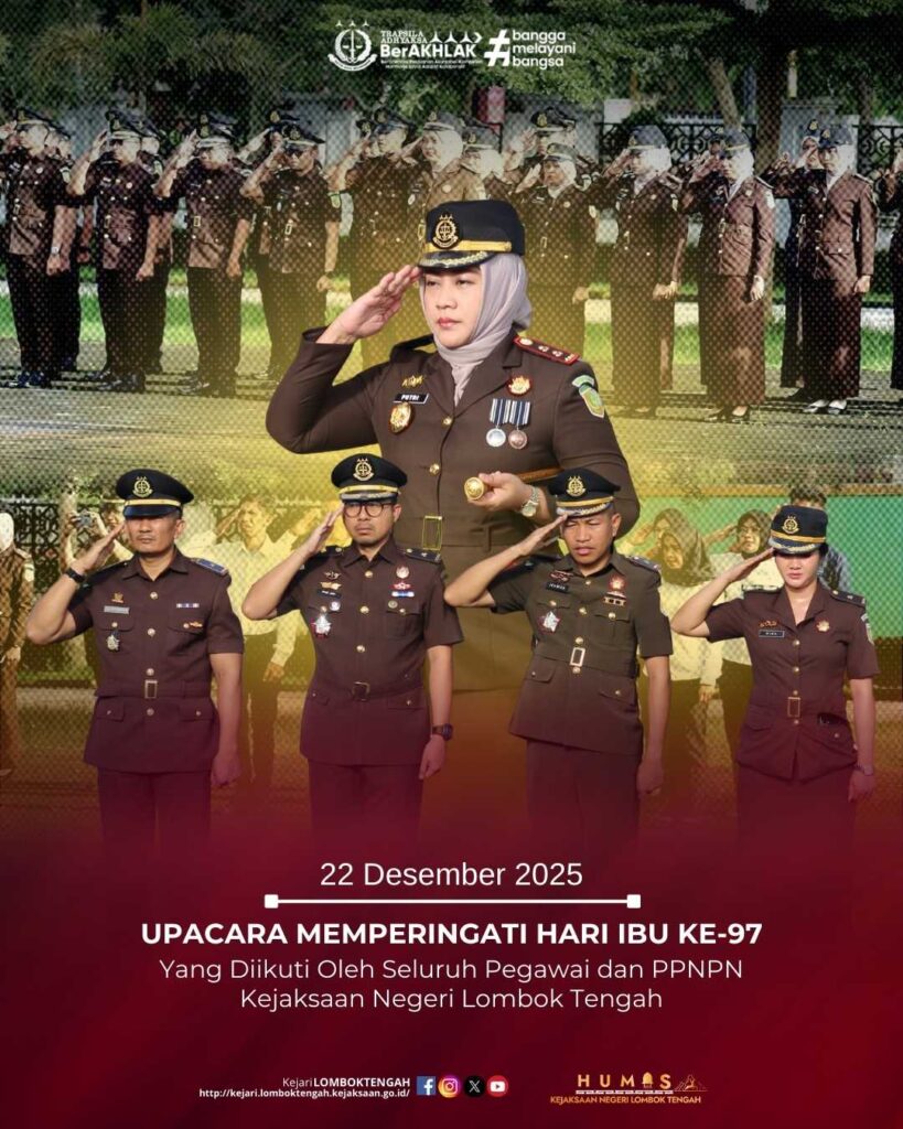 Pada hari Senin tanggal 22 Desember 2025, bertempat di Halaman Kantor Kejaksaan Negeri Lombok Tengah, Kepala Kejaksaan Negeri Lombok Tengah, Dr. Putri Ayu Wulandari, S.H., M.H., bertindak sebagai inspektur pada Upacara Memperingati Hari Ibu ke-97 dengan tema “Perempuan Berdaya dan Berkarya, Menuju Indonesia Emas 2045” yang diikuti oleh seluruh pegawai dan PPNPN Kejaksaan Negeri Lombok Tengah.