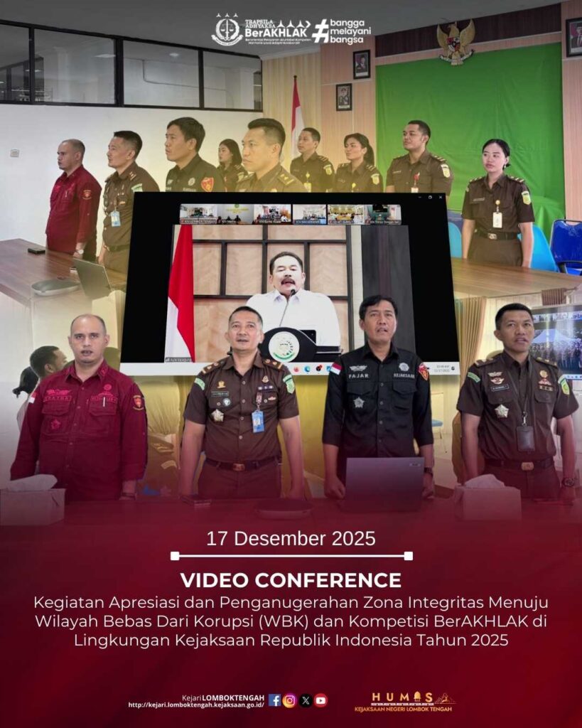 Pada hari Rabu tanggal 17 Desember 2025, bertempat di Ruang Vicon Kantor Kejaksaan Negeri Lombok Tengah, Kepala Kejaksaan Negeri Lombok Tengah diwakili Kepala Subbagian Pembinaan, Lalu Ardian Amijaya, S.H., Kepala Seksi Tindak Pidana Umum, Fajar Said, S.H., LL.M., Kepala Seksi Tindak Pidana Khusus, Bratha Hariputra, S.H., M.H., dan Kepala Seksi PAPBB, M. Ikhwanul Fiaturrahman, S.H, M.H., serta staf Kejaksaan Negeri Lombok telah mengikuti Kegiatan Apresiasi dan Penganugerahan Zona Integritas Menuju Wilayah Bebas Dari Korupsi (WBK) dan Kompetisi BerAKHLAK di Lingkungan Kejaksaan Republik Indonesia Tahun 2025 secara daring melalui Zoom Meeting.